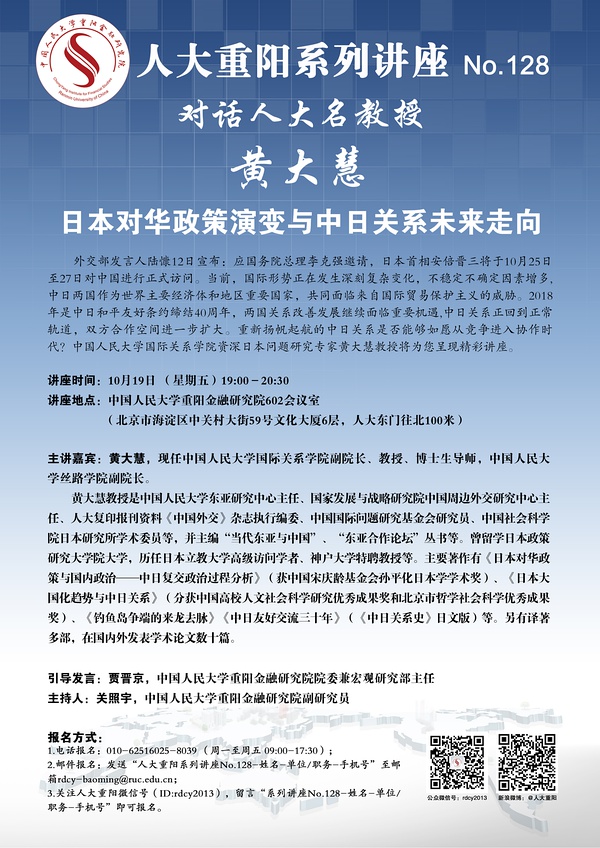 当前,国际形势正在发生深刻复杂变化,不稳定不确定因素增多,中日两国作为世界主要经济体和地区重要国家,共同面临来自国际贸易保护主义的威胁。2018年是中日和平友好条约缔结40周年,两国关系改善发展继续面临重要机遇,中日关系正回到正常轨道,双方合作空间进一步扩大。重新扬帆起航的中日关系是否能够如愿从竞争进入协作时代?中国人民大学国际关系学院资深日本问题研究专家黄大慧教授将为您呈现精彩讲座。