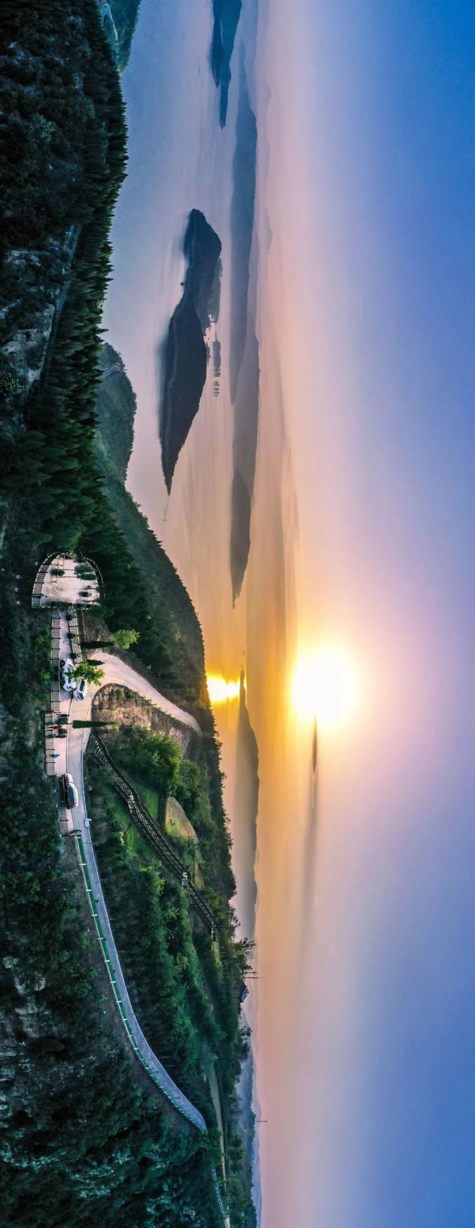 林木遮掩间诗情画意,落日熔金处长河如练。