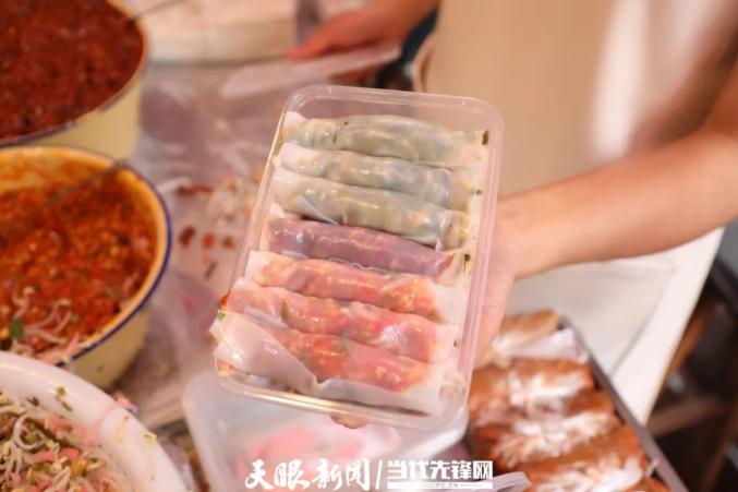 在安顺,也有类似的美食,但被称为安顺裹卷。选用薄米皮,切成巴掌大小的正方形,先放上一层秘制辣椒酱,再放酸萝卜、绿豆芽、海带丝、折耳根等多种素菜,裹起来,一口吃下,令人回味无穷。