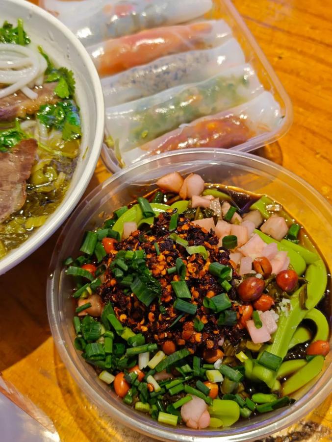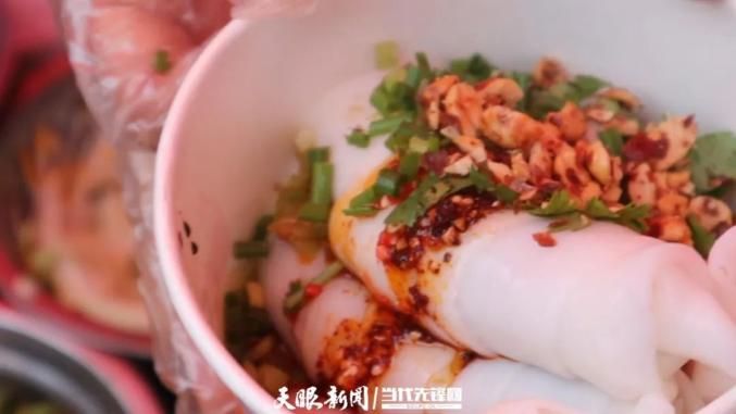 “村超”球场外的小摊上,榕江卷粉是必吃榜前五。榕江嬢嬢将瘦肉、笋干、干豆腐、豇豆等切块炒熟备用。用米浆蒸制的粉皮平铺于桌上,分成若干个三角形,将制作好的配料舀放到粉片内,包裹起来,便成了卷粉,将其剪成小节,淋上酱油、豆腐卤水、酸醋、撒上葱花、姜米、辣椒油等,边拌边吃,是消暑美食的上乘之选。