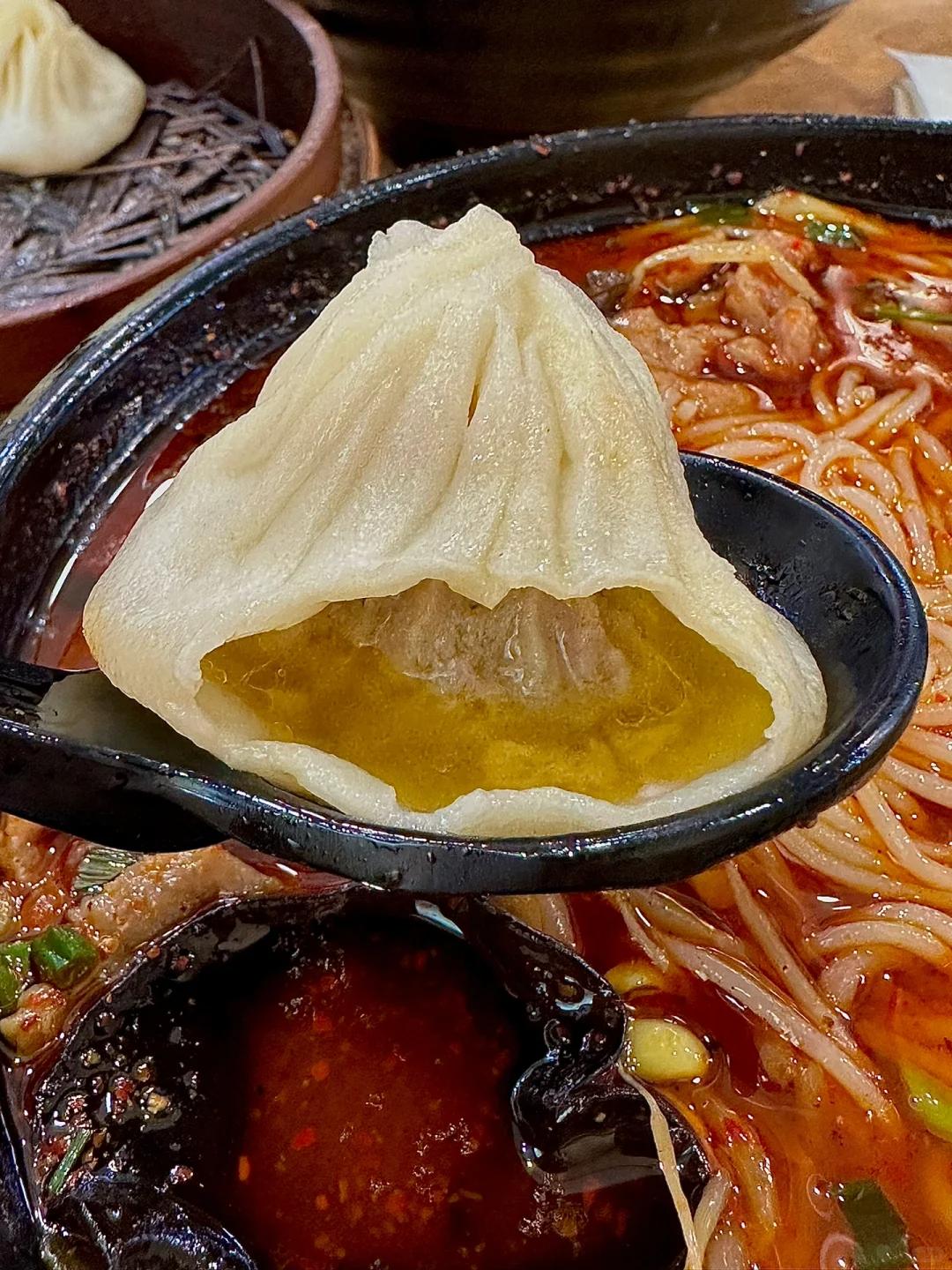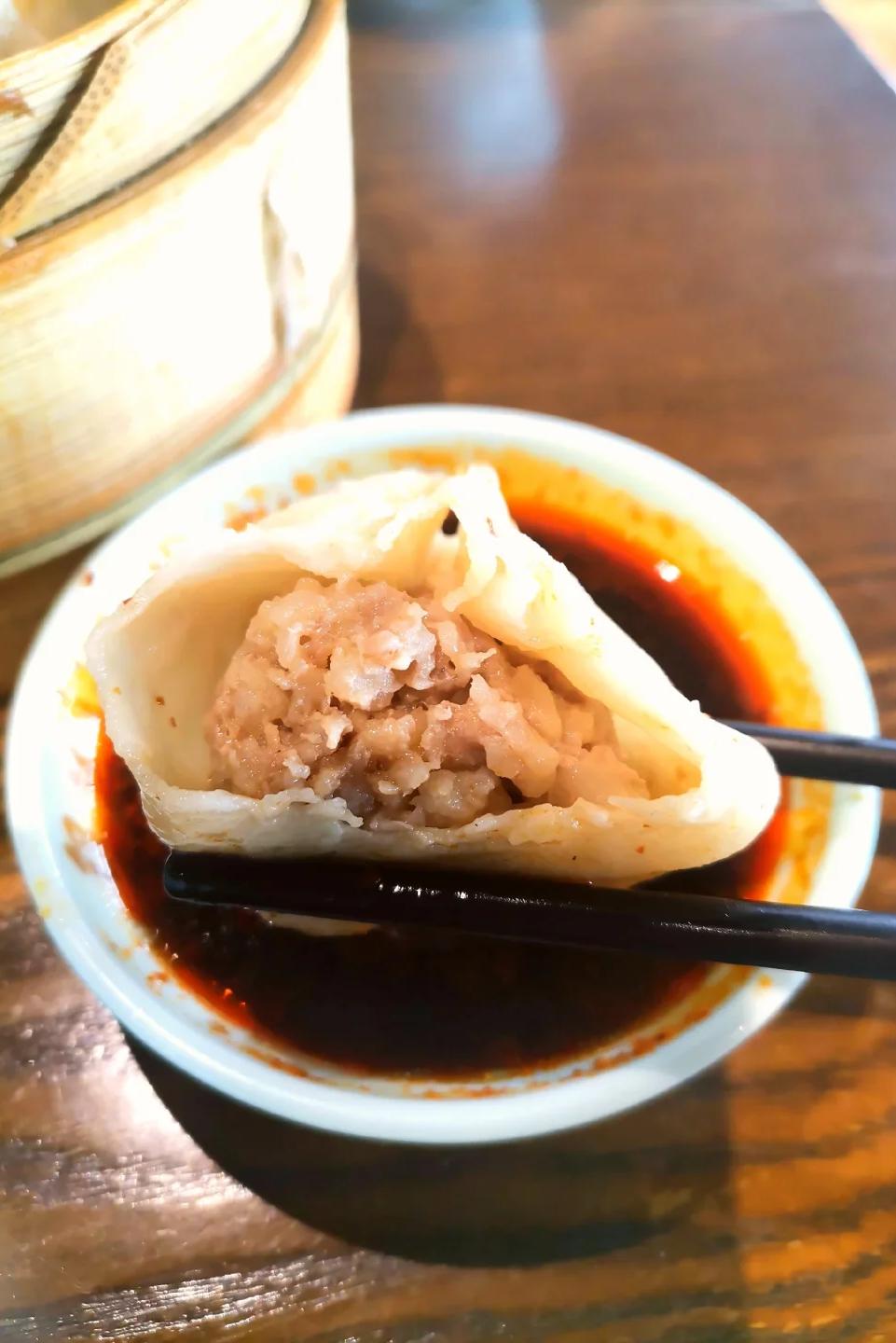 任由醋汁的酸和肉汁的鲜,细密交织在一起。小心地咬开小笼包的皮子,再一口气吸尽鲜美的汤汁。