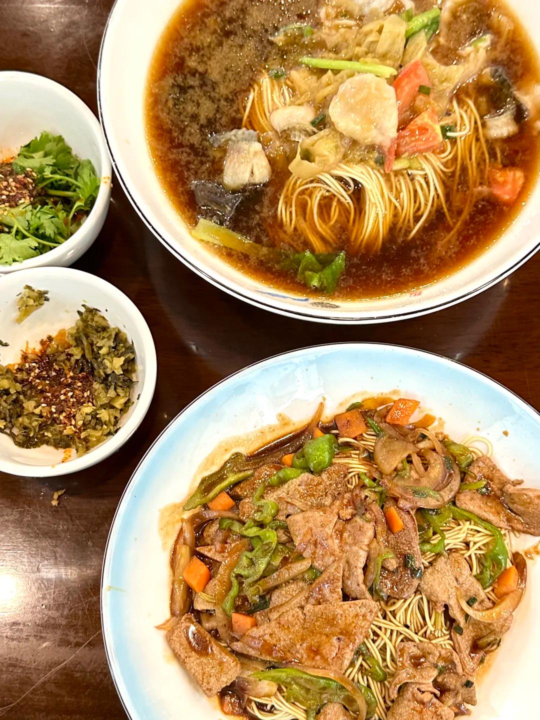 一家老字号面馆,面分别是干拌、红汤、白汤的做法,配菜明档一目了然。