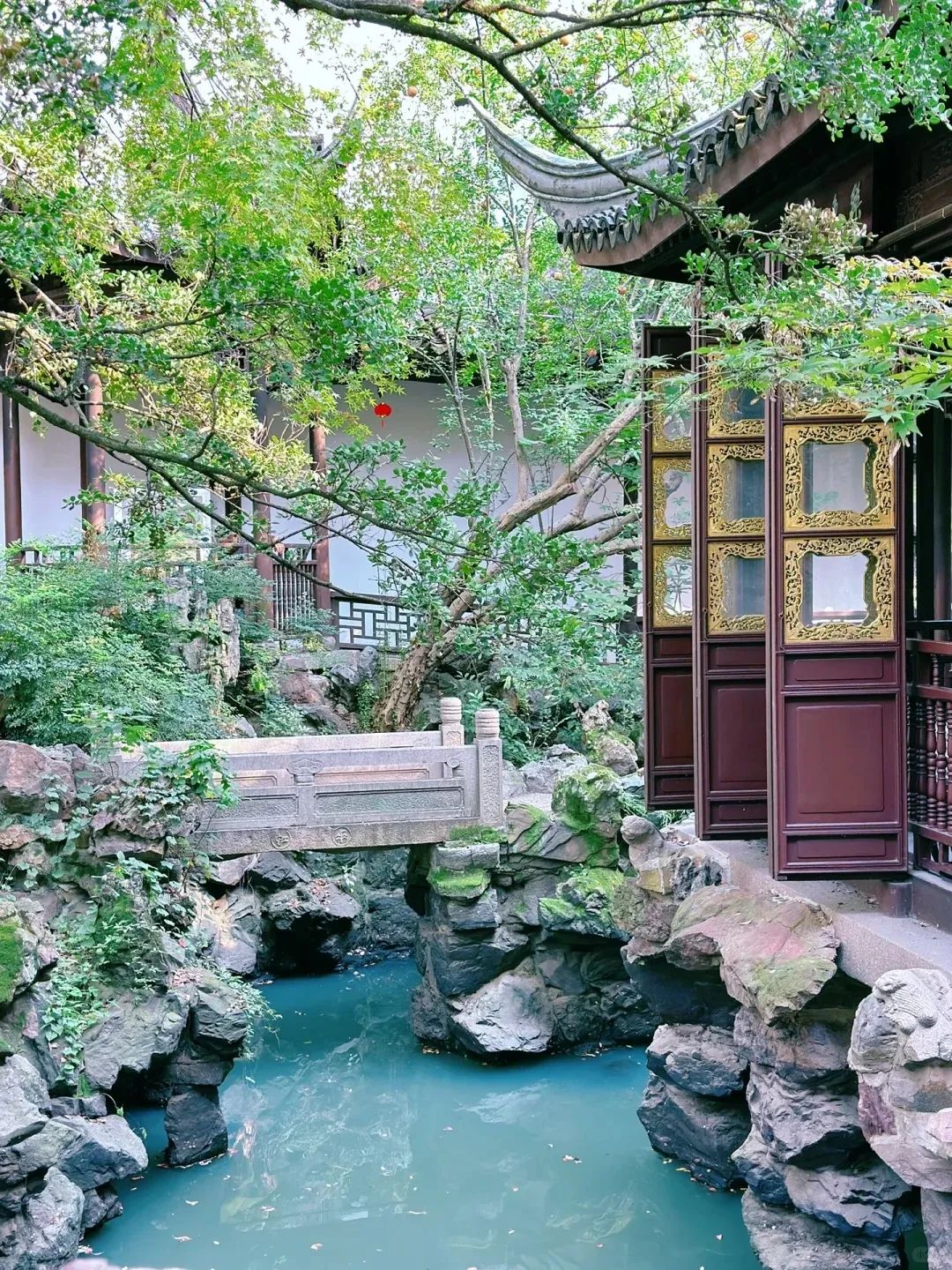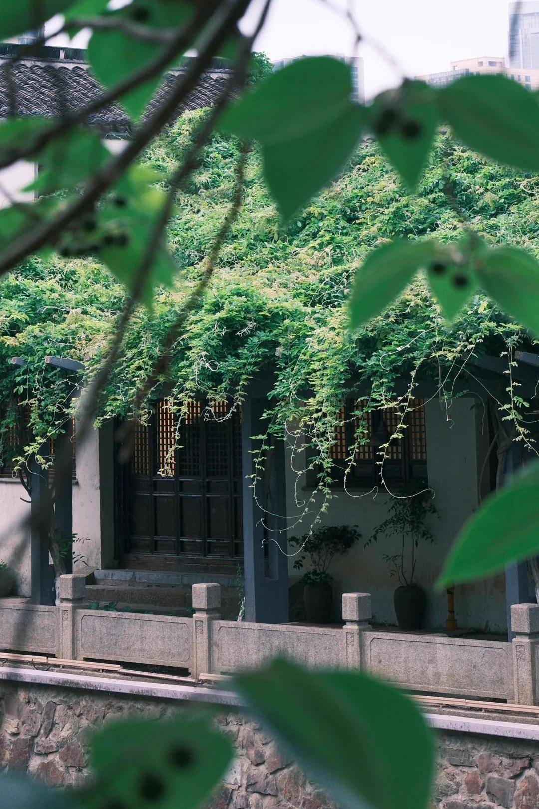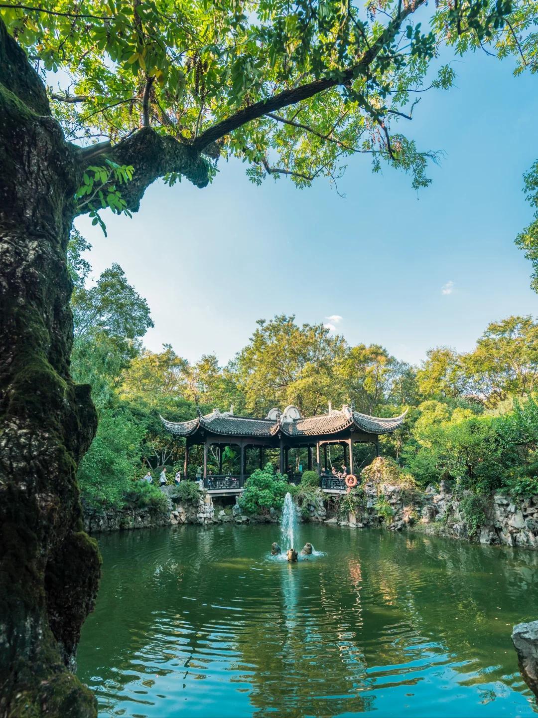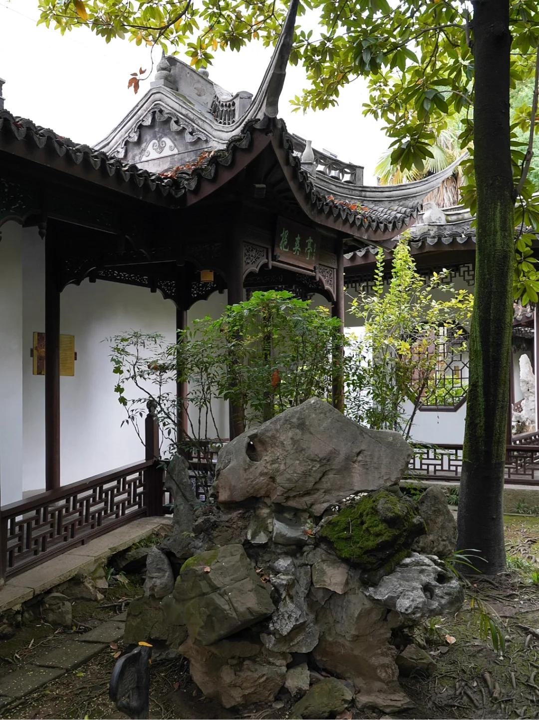 穿梭在狭长的小径间,偶遇四面透空的滴翠轩,回廊重叠的四宜厅,倚栏临池的乐鱼榭,还有一株株百年古树,婆娑多姿,古雅清幽……