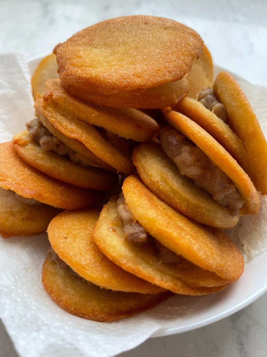 将将白豇豆去皮,浸泡至变软,化成浓浓的浆汁,随后摊成一元硬币稍大些的形状,经过油煎或烘烤,变得金灿灿,凑到鼻尖,豆香浓郁。