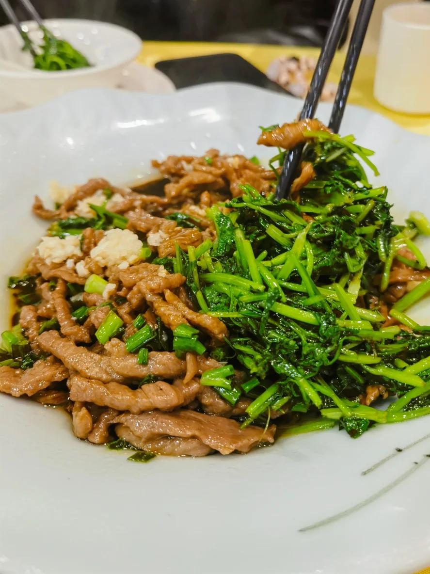 还有香菜牛肉,牛肉、香菜两位都是主角,讲究一个“嫩”。两位主角还得相得益彰,不去抢戏,这就彰显厨师。
