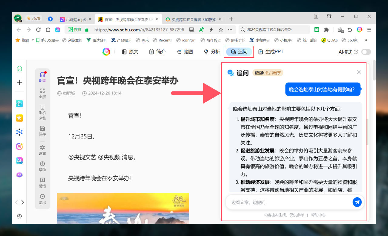 网页进入阅读模式后,支持简介、脑图、重点、分析、追问、生成PPT等6项AI能力。