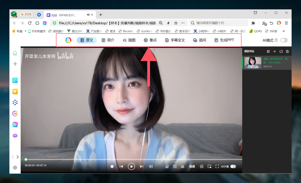 一、 功能场景 1、 视频模式播放视频时支持简介、脑图、重点、分析、全文、追问、字幕、生成PPT等8项AI能力。