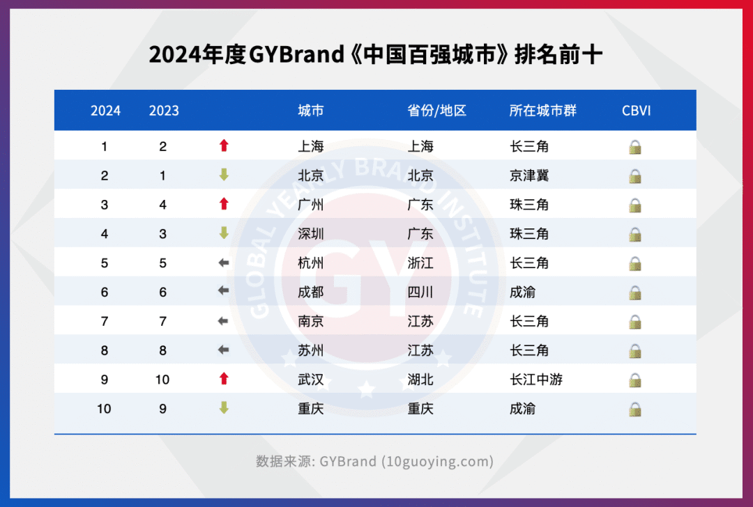 在本次发布的“2024年中国百强城市排行榜”中,排名前十位的城市依次为上海、北京、广州、深圳、杭州、成都、南京、苏州、武汉、重庆。