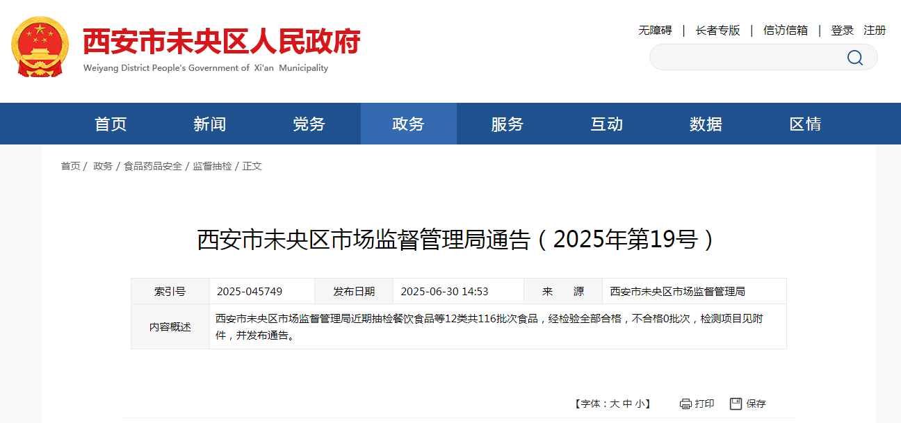 近期,西安市未央区市场监督管理局组织抽检餐饮食品,调味品,豆制品,糕点,酒类,粮食加工品,乳制品,食糖,食用农产品,食用油、油脂及其制品,水果制品,糖果制品12类食品共116批次样品,根据食品安全国家标准检验和判定,其中抽样检验项目合格样品116批次,不合格0批次。