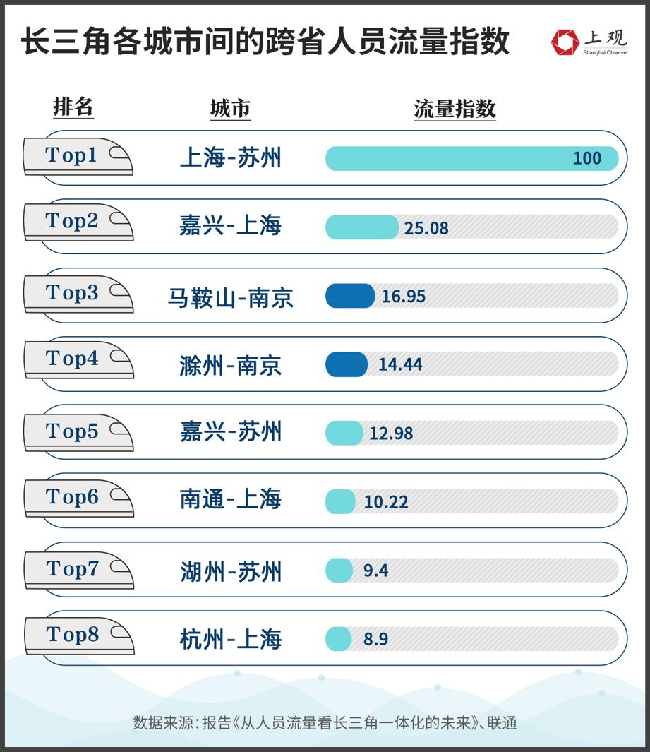 复旦大学长三角一体化发展研究院前不久发布的报告统计了长三角各城市间的短期人员流动指数(主要由商业往来,工作日常通勤以及短期旅行构成),南京和马鞍山、南京和滁州之间的人员交流指数,仅次于上海与苏州、嘉兴与上海。