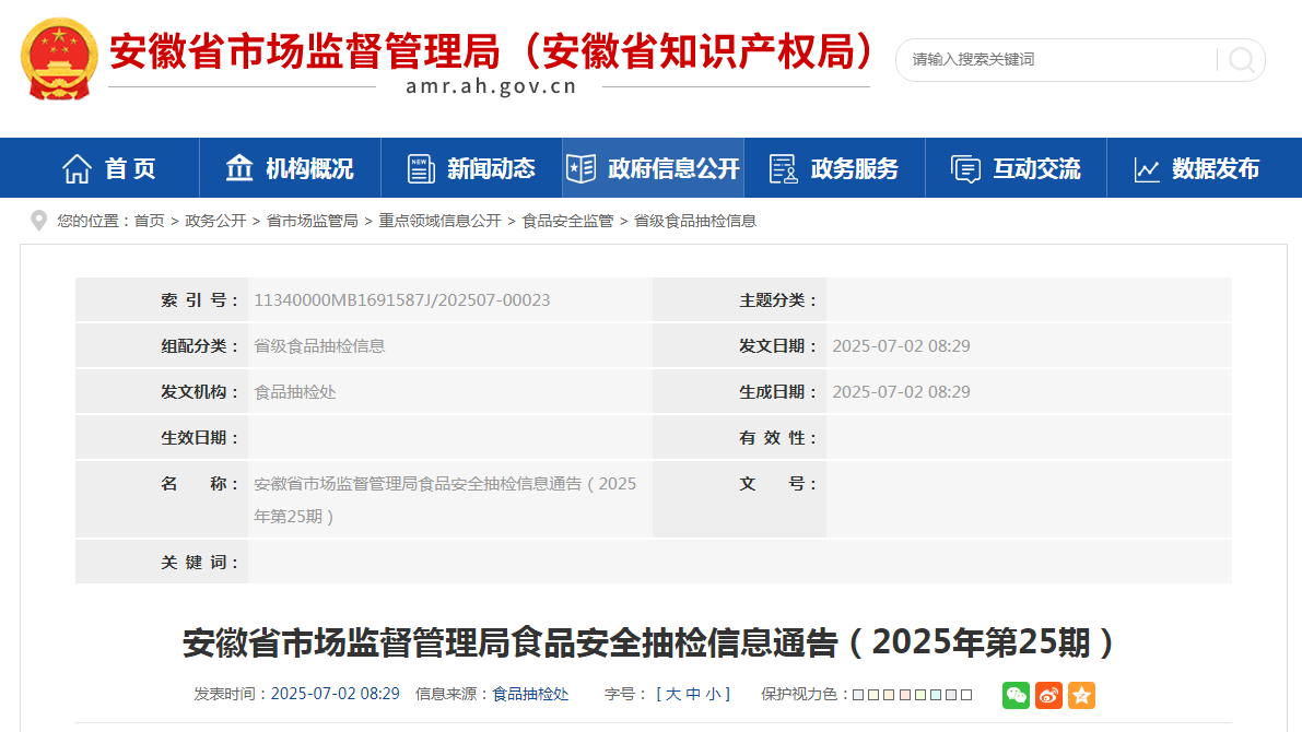 安徽省市场监督管理局食品安全抽检信息通告(2025年第25期)