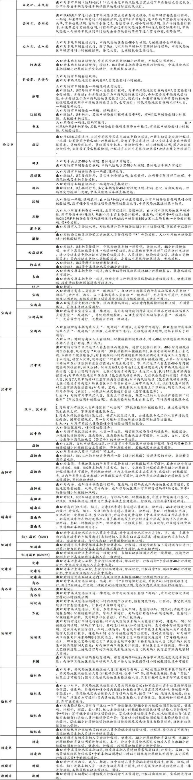 港务区收费站对所有人员查验双码、对除陕牌外的车辆查验48小时内核酸证明,登记后予以放行。阎良收费站入口所有车辆查验行程码。出口所有车辆查验行程码,中高风险地区车辆行程码带星号的查验48小时核酸报告。高陵收费站入口所有车辆健康码、行程码需为绿码方可通行。出口陕A、陕U正常通行,省内风险地区及外地车辆需48小时核酸、健康码、行程码,无异常可通行。韩城收费站对外省及西安、咸阳、杨凌、汉中来返人员查验48小时核酸报告,测温、验码,对宝鸡、铜川进韩车辆人员一律进行劝返或集中隔离,对中高风险地区进韩返韩人员一律进行劝返,其他区域车辆正常扫码、测温。澄城收费站对于西安、咸阳、杨凌来澄人员扫两码、查验48小时核酸予以放行。对于本省铜川、宝鸡、安康以及省外或行程卡有省外旅居史来澄返澄人员查验两码、48小时核酸并现场采样核酸。省内其他地区来澄返澄人员查验两码、48小时核酸。渭南市查验两码予以放行。对于省外中高风险区域的城市人员和车辆且在该城市风险范围内进行过行程旅居史的车辆和人员3天集中隔离+7天居家健康监测。芝川收费站出口对外省及西安、咸阳、杨凌、汉中来返人员实行“一测两查”、48小时核酸报告,对宝鸡、铜川来返人员一律劝返,其他区域车辆正常扫码、测温。合阳收费站出口对所有来合返合车辆查验双码,无风险地区车辆人员正常通行;对西安、铜川、宝鸡、汉中、咸阳、杨凌地区来合返合车辆人员查验双码及48小时核酸阴性后通行;对中高风险地区(包括发生疫情但未划定风险区域的地区)所在地区来合返合车辆人员逐个登记测温、查验双码及48小时核酸阴性证明基础上现场再进行一次核酸检测。龙门、龙门工业园收费站对外省及西安、咸阳、杨凌、汉中来返人员查验48小时核酸报告和测温、验码,对宝鸡、铜川进韩车辆人员一律进行劝返或集中隔离,对中高风险地区进韩返韩人员一律进行劝返,其他区域车辆扫码、测温。荆姚收费站出口对行程码带*来返人员一律查验48小时核酸,并就地采集一次核酸,同时每人填写登记表,对安康、上海、天津、吉林、江苏、山东等疫情严重的省市,原则上予以劝返,实行3天集中隔离+7天健康监测措施。蒲城收费站出口对非渭南行程车辆人员必须现场核酸检测;对安康、上海、天津、吉林、江苏、山东等疫情严重的省市车辆人员原则上劝返,或实行3天集中隔离+7天健康监测措施。孙镇收费站出口对所有来孙镇车辆查验双码,对非渭南地区实行采集一次核酸,登记;对行程码有上海、天津、吉林、江苏、山东原则上进行劝返,或实行3天集中隔离+7天健康监测。富平收费站出口对于西安、咸阳、汉中来富人员扫两码、查验24小时核酸予以放行。对于铜川、宝鸡、安康以及省外返富人员查验两码并现场采样核酸。省内其他地区返富人员查验两码正常放行。对于省外中高风险地区的人员和车辆采取集中或居家隔离。