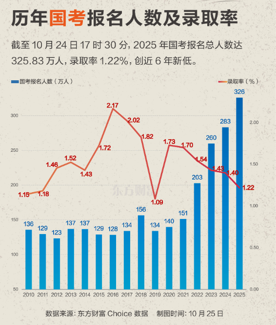 “上岸”在今天的青年当中变得越来越重要。以国家公务员考试为例,2021年以来一直呈考生快速增长的趋势。据国家公务员局的数据,2023年“国考”的总报名人数突破259.8万,竞争最激烈的岗位报名与录取比例超过5800∶1。2024年“国考”共计303.3万人通过用人单位的资格审查,这也是“国考”报名规模首次迈入300万大关,相比2021年几近翻番。