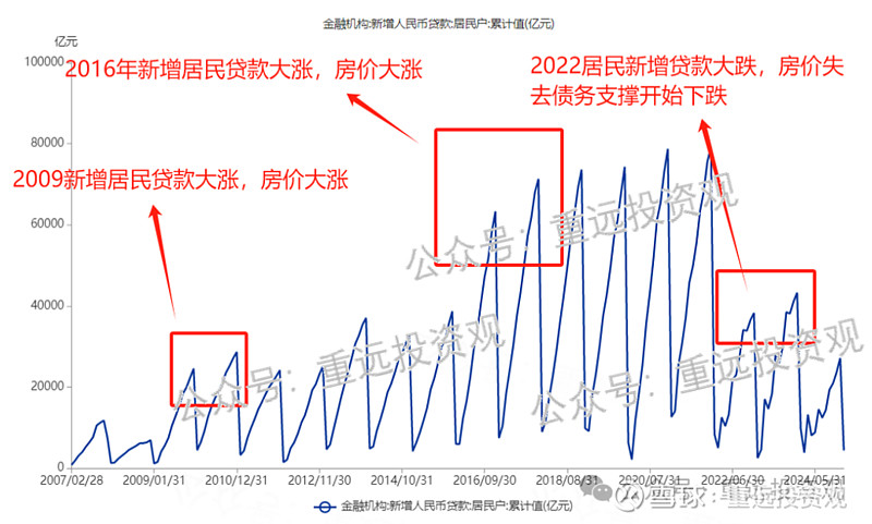 所以,我们只要看居民的整体新增贷款,就能获知楼市的增量购买力,也就能了解到楼市是否会上涨了。而文章开头的示意图,正是说明了债务和房价的关系。