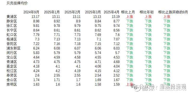 我们再以上海楼市为例看下挂牌均价(数据取自上海贝壳),会发现截止4月,绝大多数区域都未能止跌。