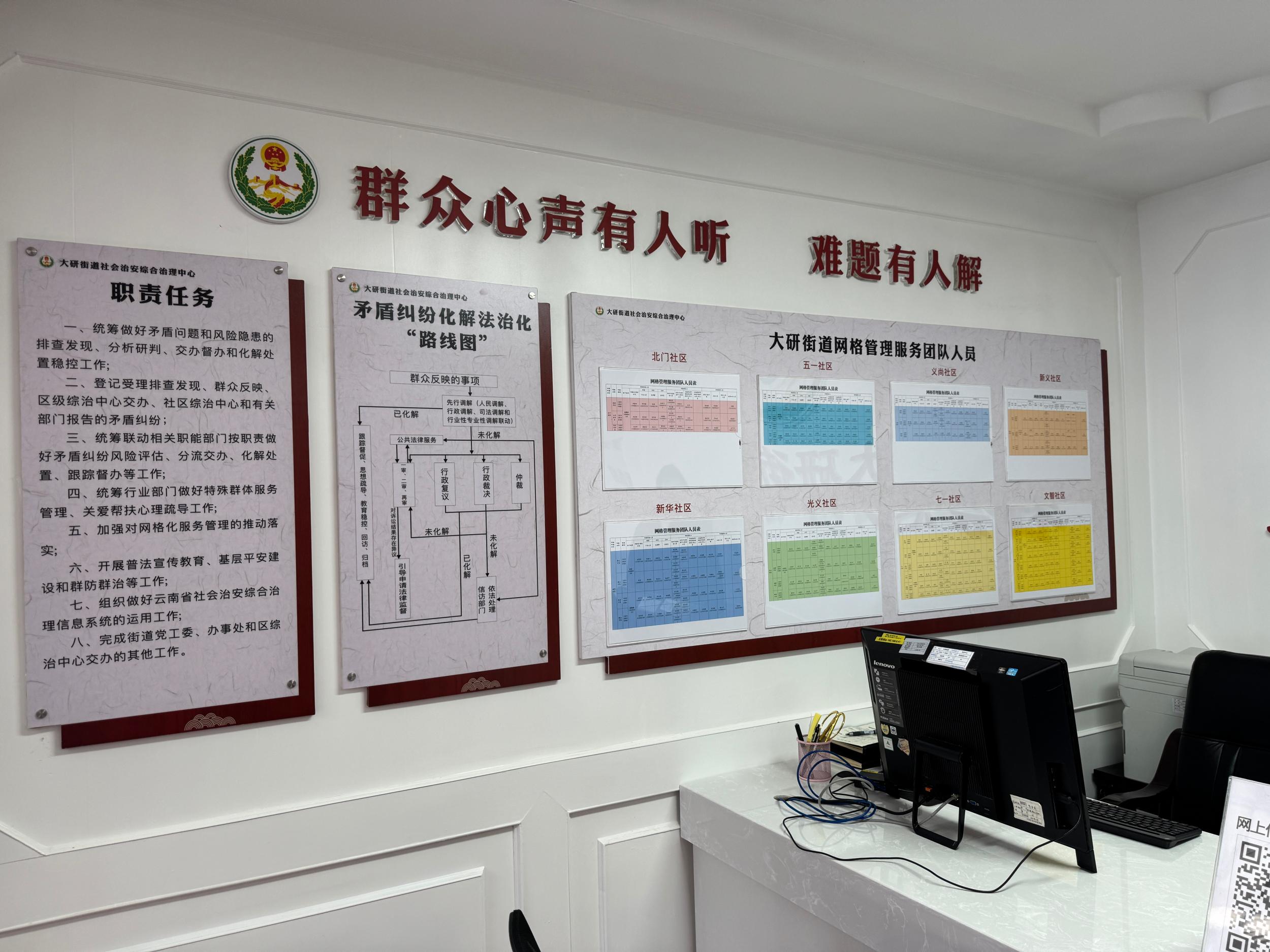 街道将古城区人民法院大研古城诉调服务站、大研司法所、街道平安法治办公室集中于一处联合办公,实现资源高效共享与协同发力。科学布局群众接待室、特色调解室、法律服务室、指挥调度室、心理咨询室五大功能室,联动古城派出所、司法所、区法院诉调服务站工作人员开展工作。同时,街道“五办三中心”人员依实际需求轮驻,真正做到让群众化解矛盾纠纷“最多跑一地”。