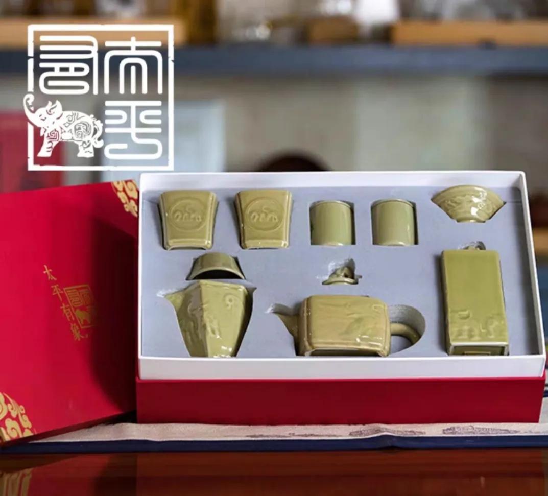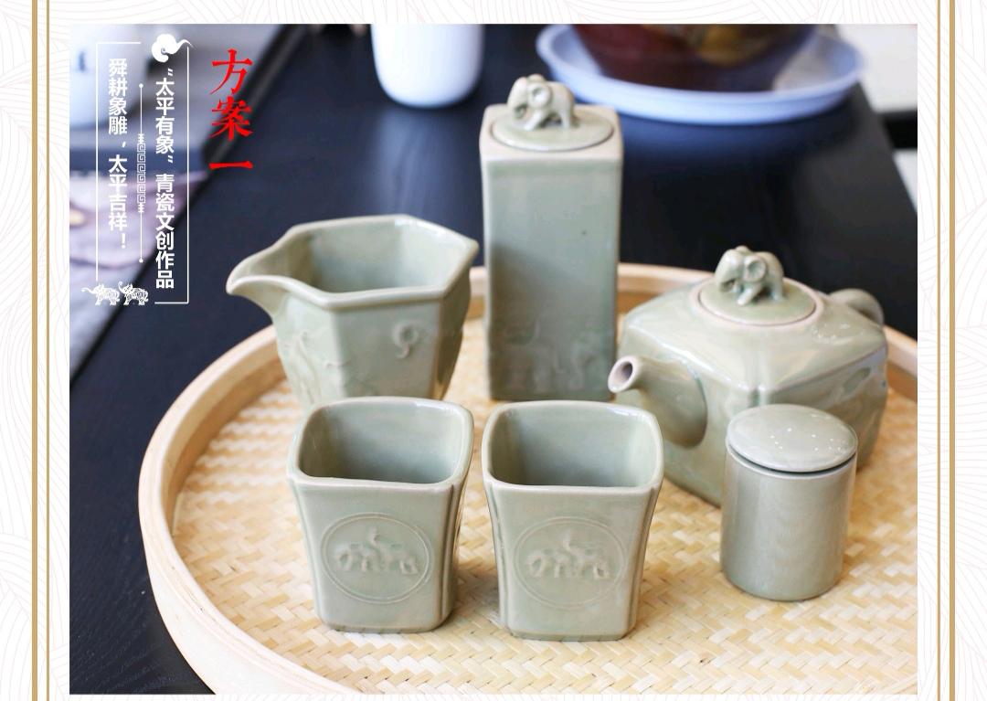 整套越窑青瓷罐身都浮雕了生动形象的大小象,“舜耕群雕”是韩美林大师石雕的亚洲第一规模的象群,寓意着太平吉祥。