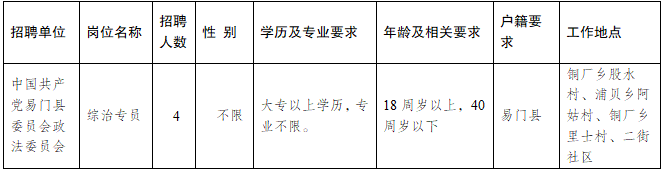 原标题:中共易门县委政法委招聘劳务派遣制综治专员公告