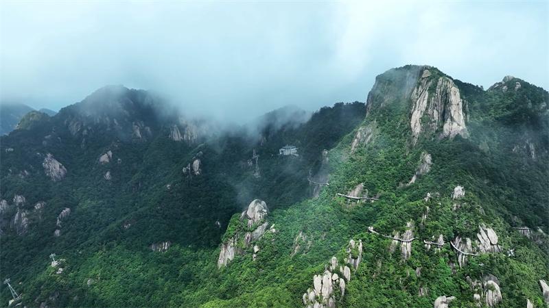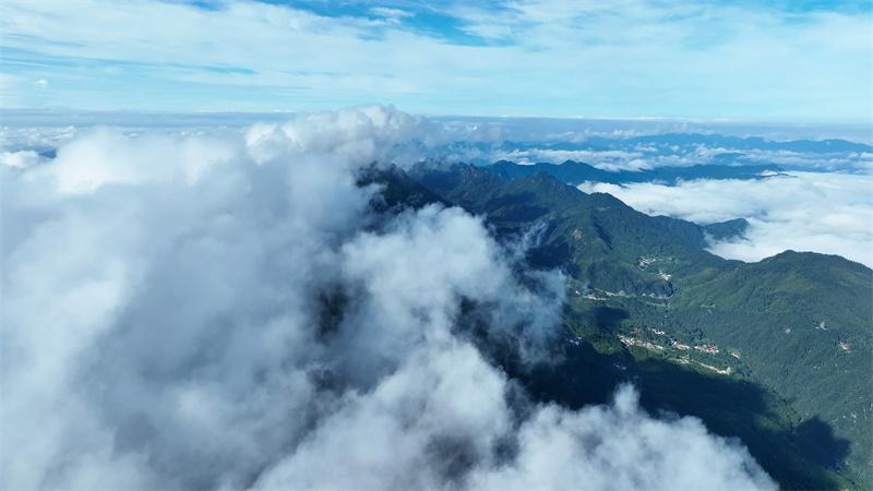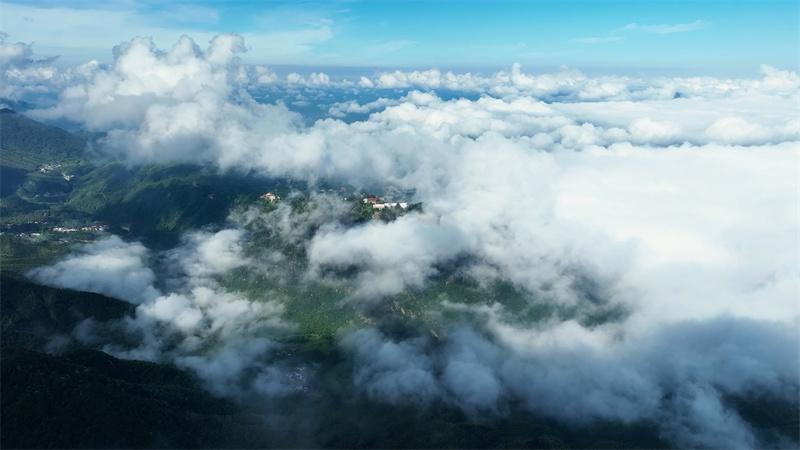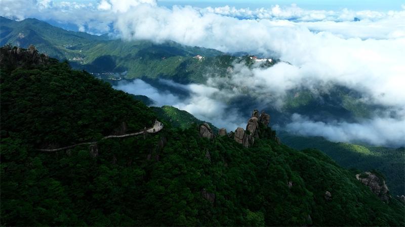 夏日雨后,安徽省池州市九华山天台景区景色如画。缥缈的云涛若素练翩跹,在群峰之间流转徘徊,宛如一幅流动的水墨丹青。