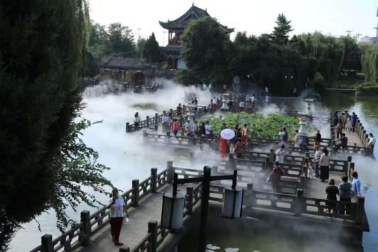 同时,东湖景区曲桥雾森景观与满池荷花相映成趣,夜晚的南大门广场游客如织,争相打卡拍照。六营泥塑村的中国泥塑体验园同样人气高涨,先后接待西安交通大学、西安美术学院等高校师生500余人。