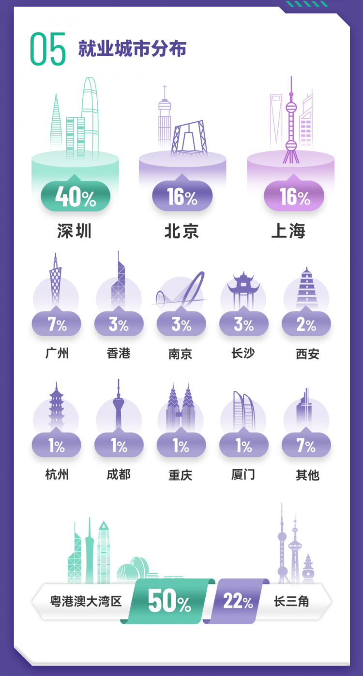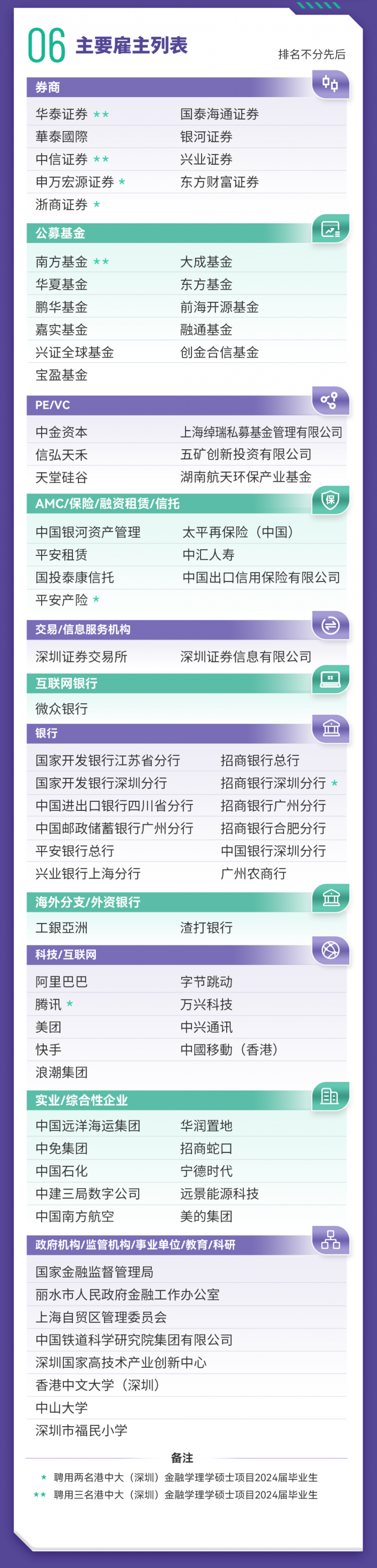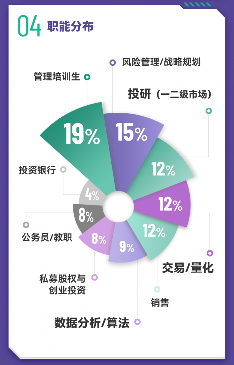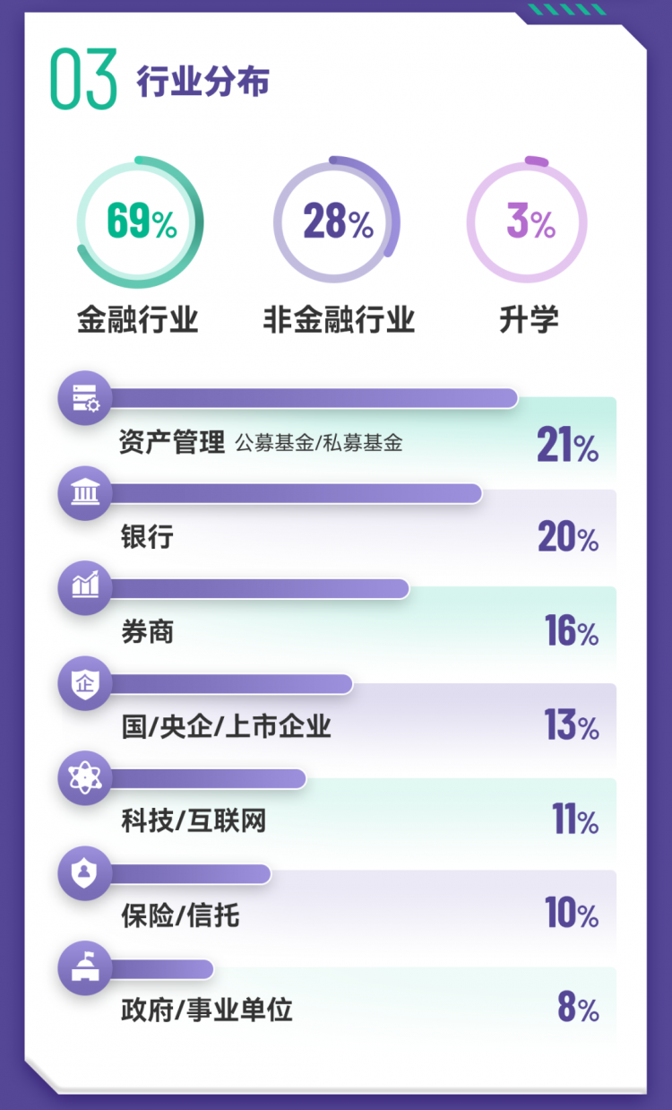 内地头部机构录用比例逆势增长,雇主覆盖中信证券、华泰证券、国泰海通、申万宏源等头部券商;中金资本、天堂硅谷、信弘天禾等知名私募股权机构;以及华夏基金、南方基金、鹏华基金、嘉实基金等公募基金。
