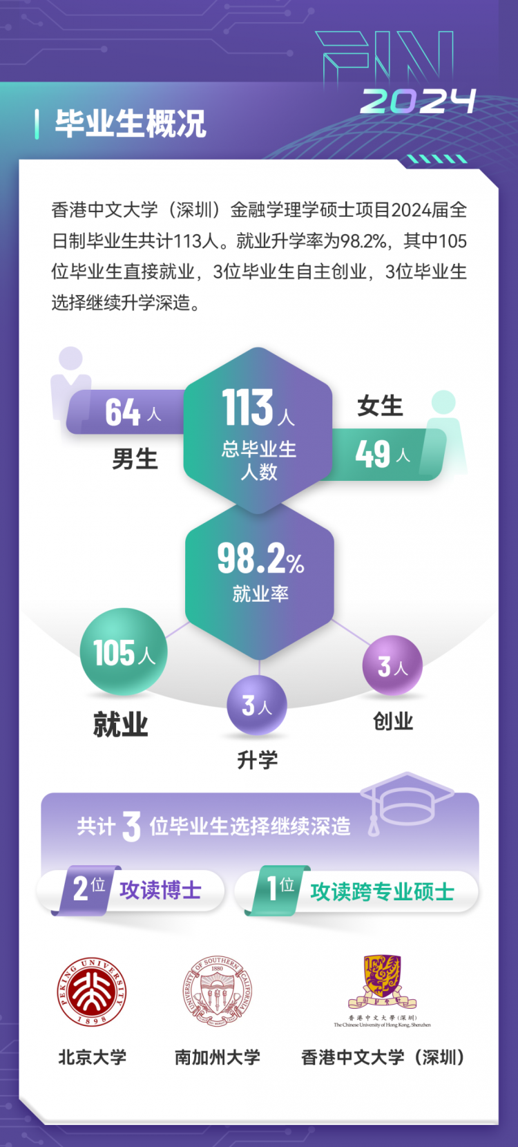 依托香港中文大学(深圳)国际化教育资源与金融学理学硕士项目的前沿课程设置,2024 届 113 名毕业生交出亮眼答卷:98.2% 顺利就业、创业或深造,直接就业者平均年薪 26.8 万元(最高 60 万),超半数入职金融及互联网头部企业。这份成绩单,印证了项目在培养复合型金融人才上的卓越实力。