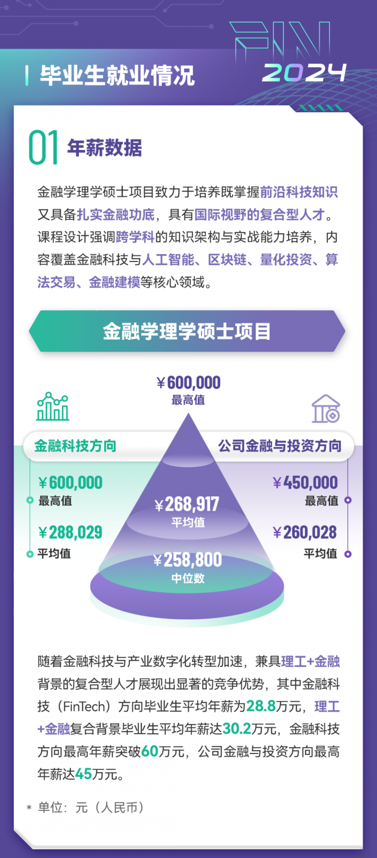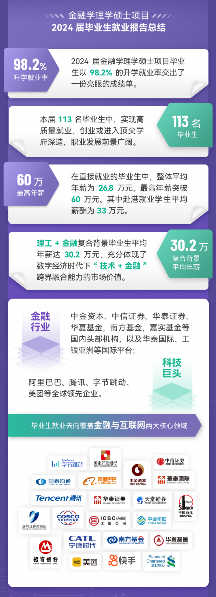 境外就业保持稳定,部分毕业生成功入职华泰国际、工银亚洲等机构,体现项目培养的国际化竞争力。