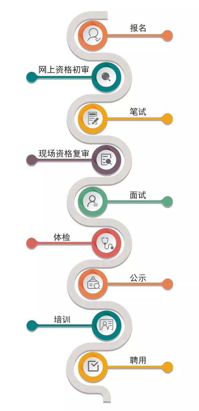 本次招聘工作人员,按照信息发布、网上报名、笔试、面试、体能测试或技能测试、体检、选聘、办理聘用手续等程序组织实施。