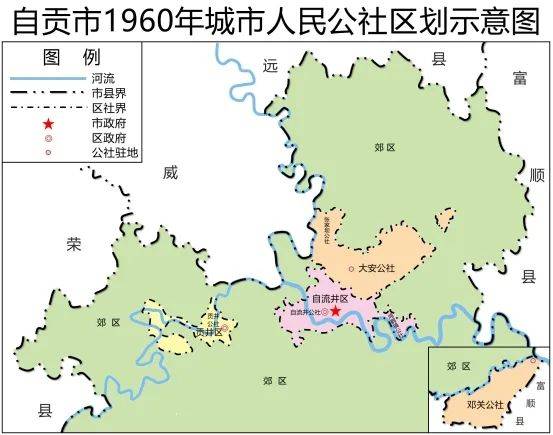 自贡市郊区已于当年2月先行接管上述地区。至1959年底,郊区辖新民(原新胜与民乐合并)、团结(原团结与胜利合并)、爱和(原爱国与和平合并)、双塘(原太平与红旗合并)、艾叶(原天池与建设合并)、荣边、仲权、漆树、舒坪、黄市、永安、富全、联络、卫坪、沿滩(原沿滩与詹井釜溪河以西)、王井(原王井全部和邓关公社釜溪河以西、永年公社川云中路以北)、九洪17个公社和沿滩镇。