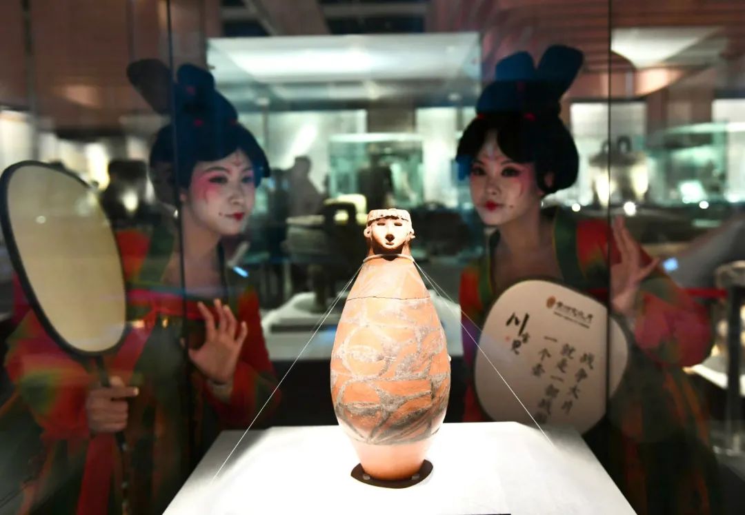 此次展览展出的文物有相当一部分曾在央视爆红的文博探索节目《国家宝藏》《如果国宝会说话》中出过镜。如青海的舞蹈纹彩陶盆、四川的水陆攻战纹铜壶、甘肃的人头形器口彩陶瓶以及河南的武曌金简等。