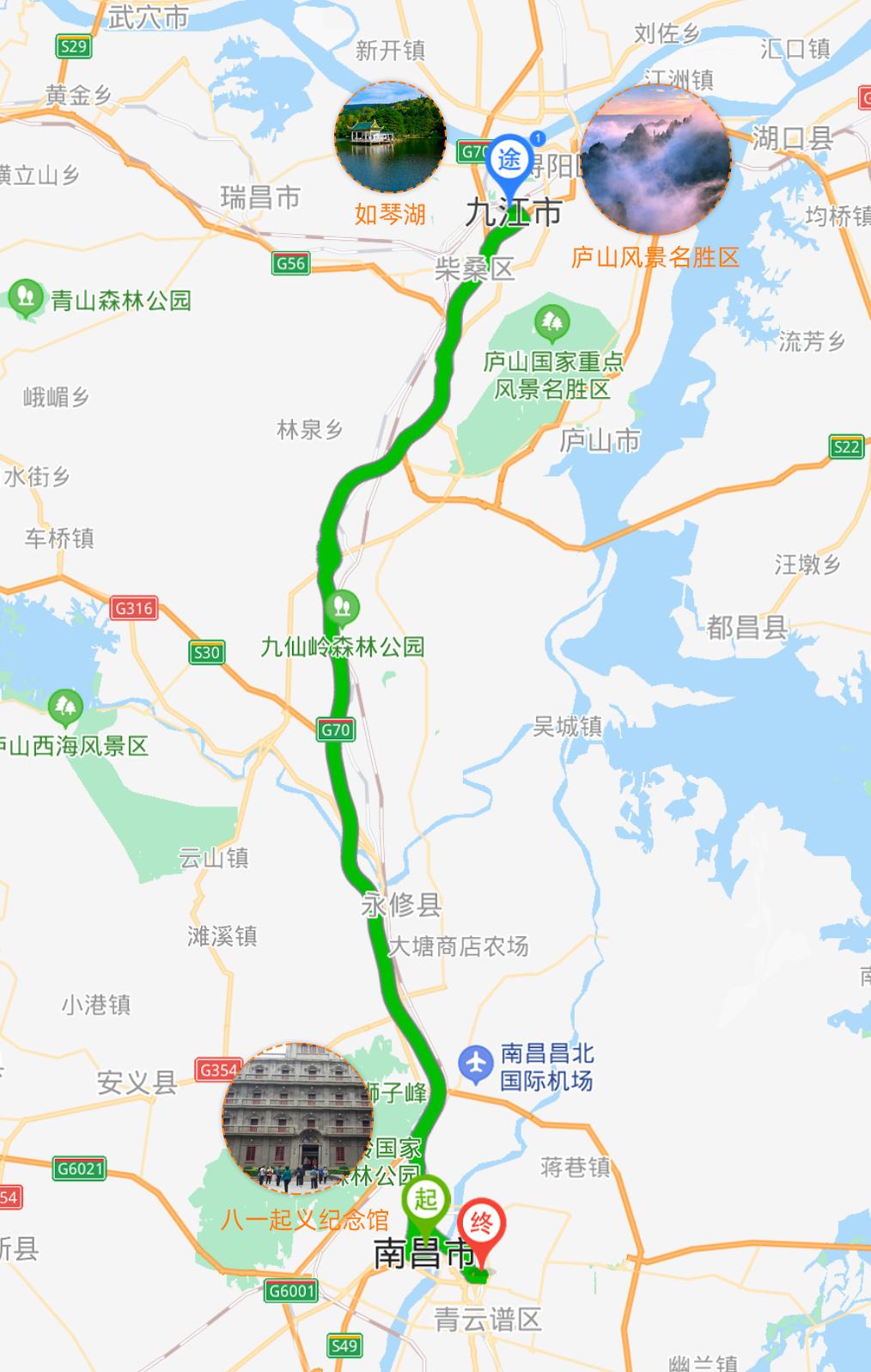 这条自驾游线路从江西南昌驱车出发,大致沿G70福银高速公路,沿途欣赏到的自然景观都集中在南昌及庐山风景名胜区两地,既有红色抗日革命景观,历史人文景观,还能欣赏到庐山的天然景观。