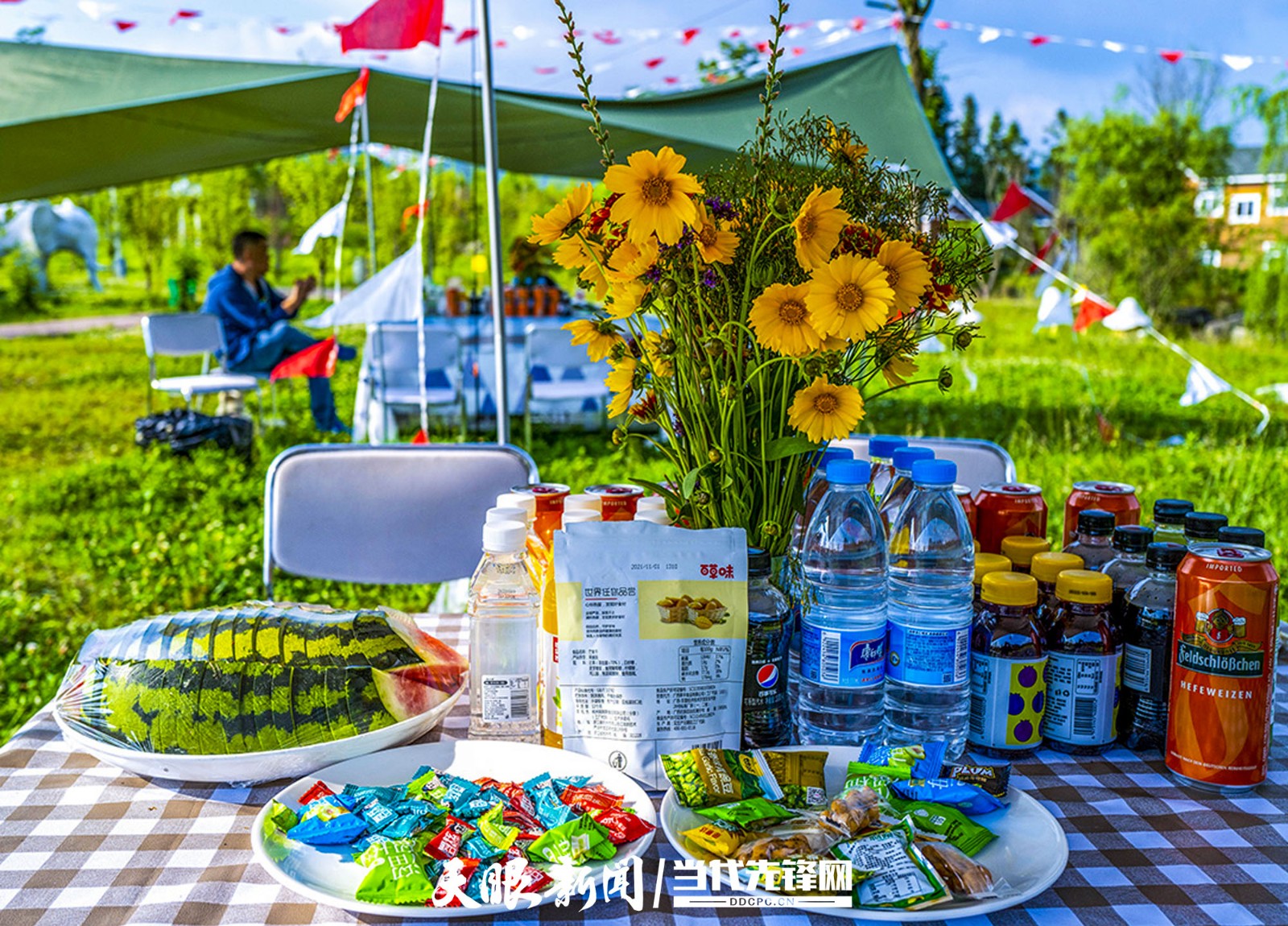 绿草地铺展着温柔,餐桌上盛着贵阳的烟火与诗意。图为游客在贵阳百花湖畔野餐聚会。