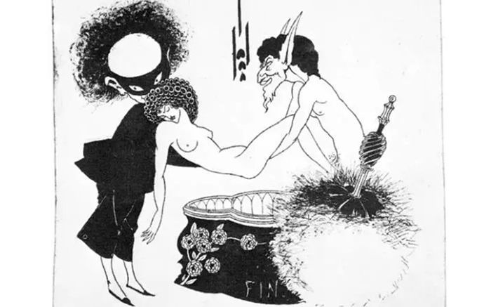 《莎乐美的葬礼》,出自著名插画家比亚兹莱为戏剧《莎乐美》所绘插图。莎乐美用色相蛊惑希律王砍下了先知施洗约翰头颅的著名典故,在西方文化中寓意深刻:情欲会带来死亡。而在比亚兹莱的插画中,死亡同样也可以带来情欲。