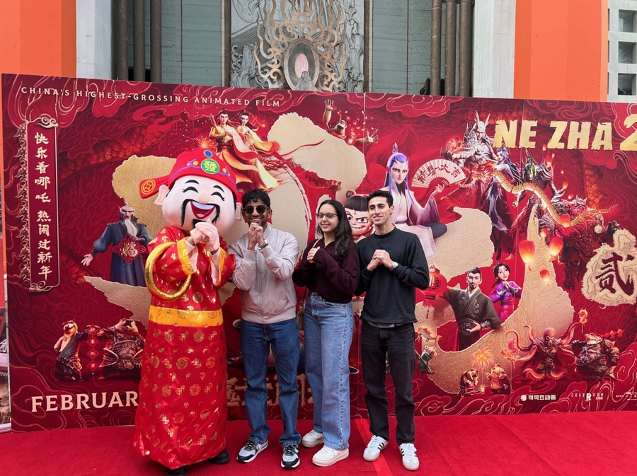 2月11日,在澳大利亚悉尼,观众在《哪吒之魔童闹海》巨幅海报前拍照。新华社记者 马平 摄