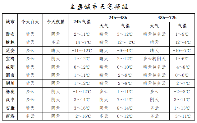 2日:陕北、关中晴天间多云,陕南晴天转多云。巴山东部局地有小雨或雨夹雪(0~1毫米)。陕北大部、关中北部有4级左右偏北风(5.5~10.7米/秒)。日平均气温陕北大部、关中北部下降4℃左右。3日:陕北晴天间多云,关中晴天转多云,陕南多云间阴天。日平均气温陕南下降4℃左右。4日:陕北多云间晴天,关中、陕南阴天转多云,秦巴山区有雨夹雪或小雪。5日:全省多云间晴天。6日:全省多云转阴天,汉中大部、安康部分地方有小雨,秦巴山区有雨夹雪或小雪。陕北大部有5~6级偏北风。日平均气温陕北下降4~6℃,关中、陕南东部下降4℃。7日:全省阴天转晴天。8日:全省晴天转多云。9日:全省多云转阴天,秦巴山区有小雪。10日:全省阴天转多云。